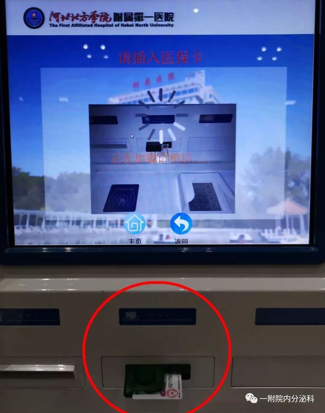点击屏幕上的医保卡图标→将医保卡插入医保卡读卡器→等待读卡→读卡完毕,进行下一步操作。