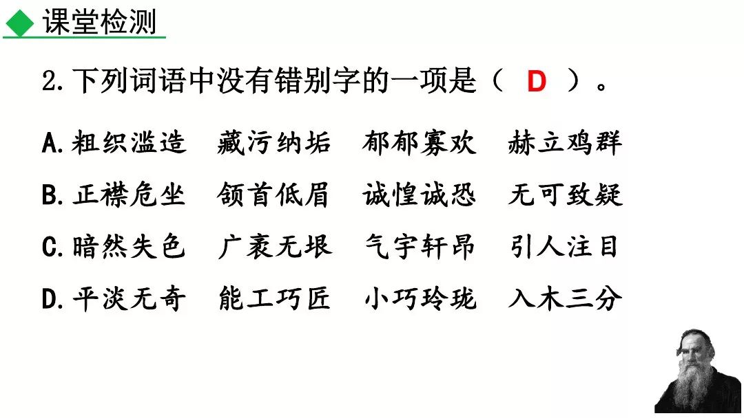 1.[解析] DA项,“劣”应读“liè”;B项,“糙”应读“cāo”;C项,“鬈”应读“quán”。
