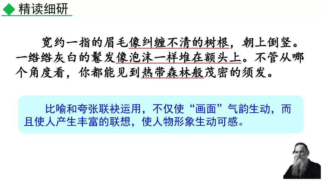 解说:这句话是指托尔斯泰的眼睛富有感情,运用的是超前夸张的修辞手法。