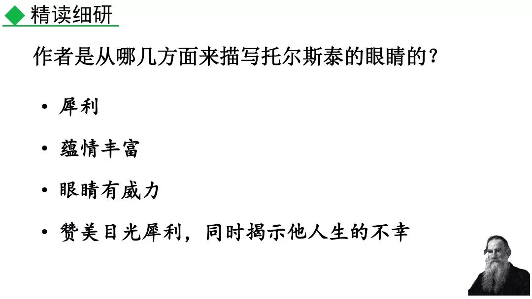 8.第一部分:刻画托尔斯泰的外貌特征。第二部分:描写托尔斯泰不同寻常的眼睛。