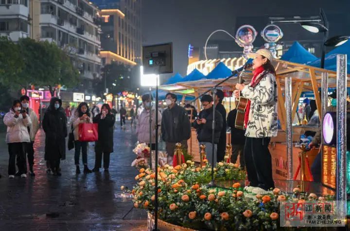 1月2日晚,杭州武林夜市,驻唱歌手唱起民谣,与观众互动;元旦假期,武林路举行开年鸿运活动,布置新年主题馆、时光音乐会、武林红兔集等,聚揽消费人气,争取新年开门红。