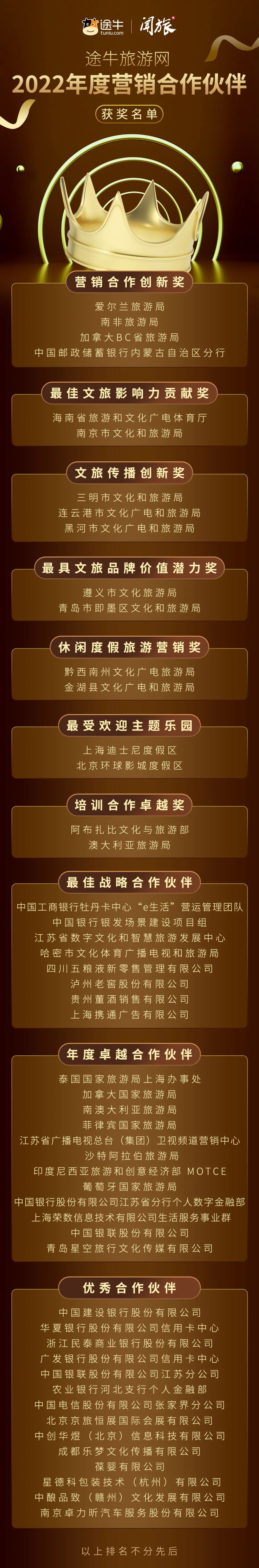 由途牛旅游网主办,旅游新媒体闻旅作为媒体支持的“2022年度营销合作伙伴奖”评选活动结果正式出炉。