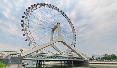 天津之眼坐落在天津市红桥区海河畔,是一座跨河建设、桥轮合一的摩天轮,兼具观光和交通功用。