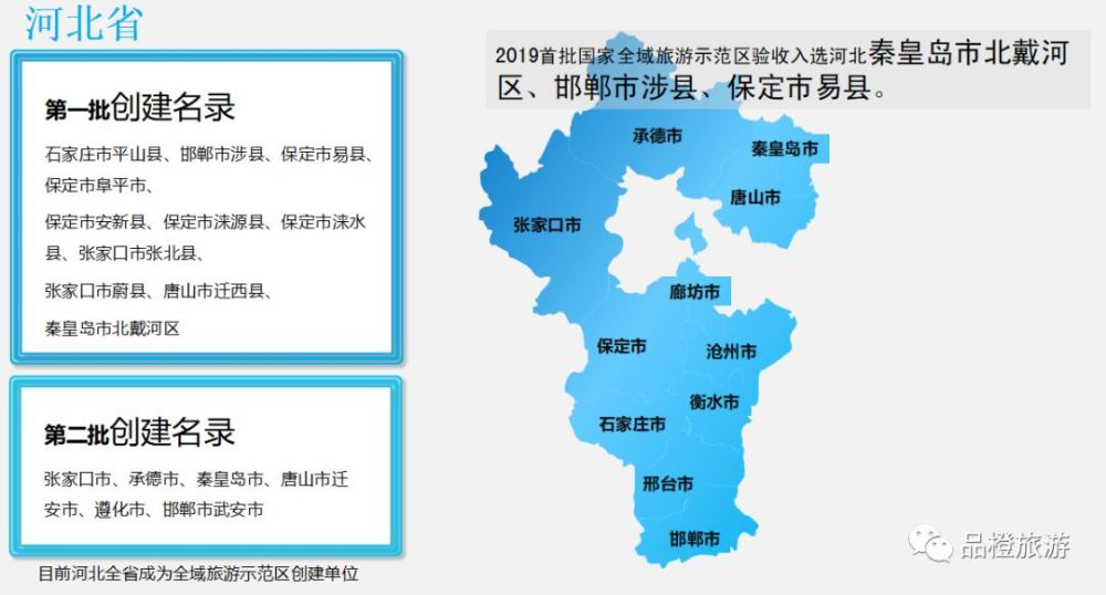 在国家全域旅游示范区创建名录中,河北省首批入选11个、第二批入选6家。本次有3个正式入选“首批国家全域旅游示范区”,分别是秦皇岛市北戴河区、邯郸市涉县、保定市易县。