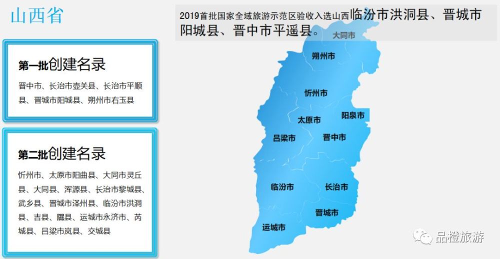 在国家全域旅游示范区创建名录中,山西省首批入选5个、第二批入选15家。本次有3个正式入选“首批国家全域旅游示范区”,分别是临汾市洪洞县 、晋城市阳城县、晋中市平遥县。