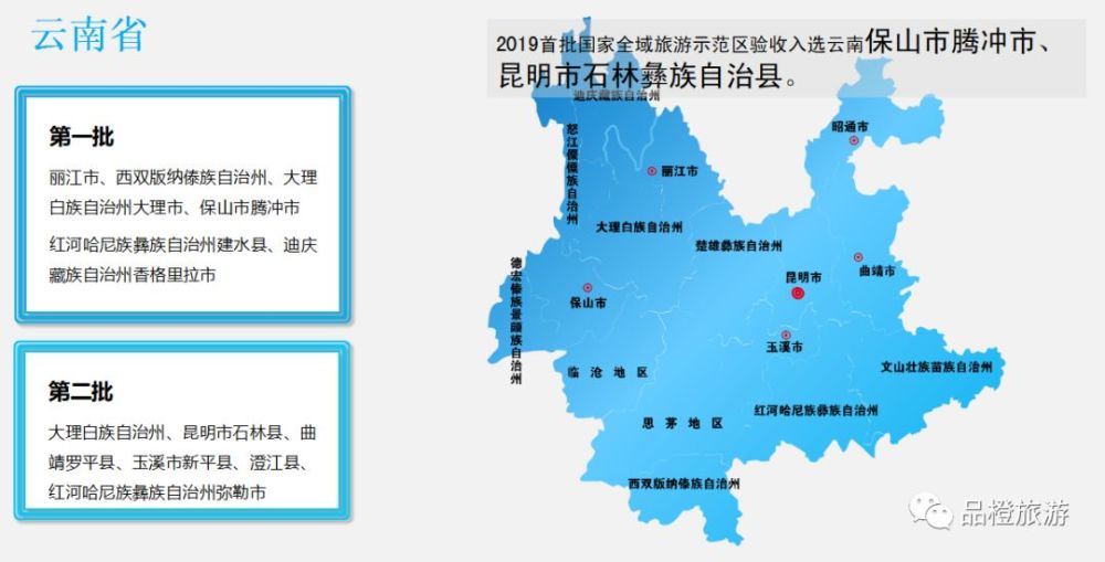 在2016国家全域旅游示范区创建名录中,云南省首批入选6个、第二批入选6家。本次有2个正式入选“首批国家全域旅游示范区”,分别是保山市腾冲市和昆明市石林彝族自治县。