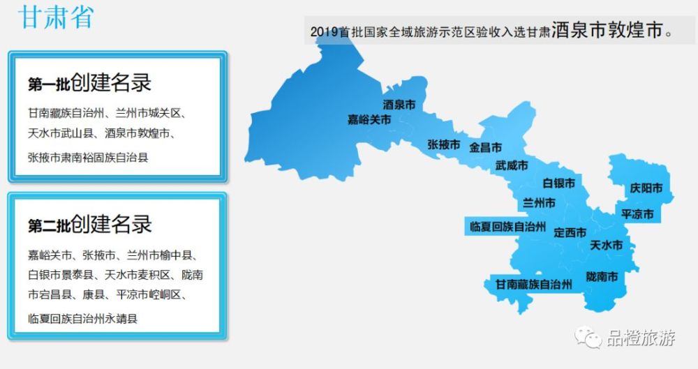 在2016国家全域旅游示范区创建名录中,甘肃省首批入选5个、第二批入选9家。本次有1个正式入选“首批国家全域旅游示范区”,是酒泉市敦煌市。
