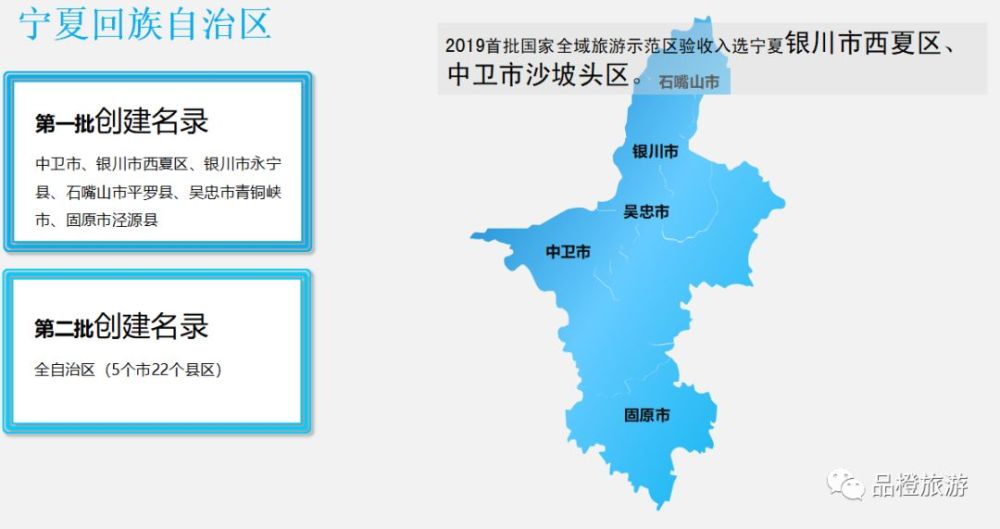 在2016国家全域旅游示范区创建名录中,宁夏回族自治区首批入选6个、全自治区(5个市22个县区)均入选第二批。本次有2个正式入选“首批国家全域旅游示范区”,分别是银川市西夏区和中卫市沙坡头区。