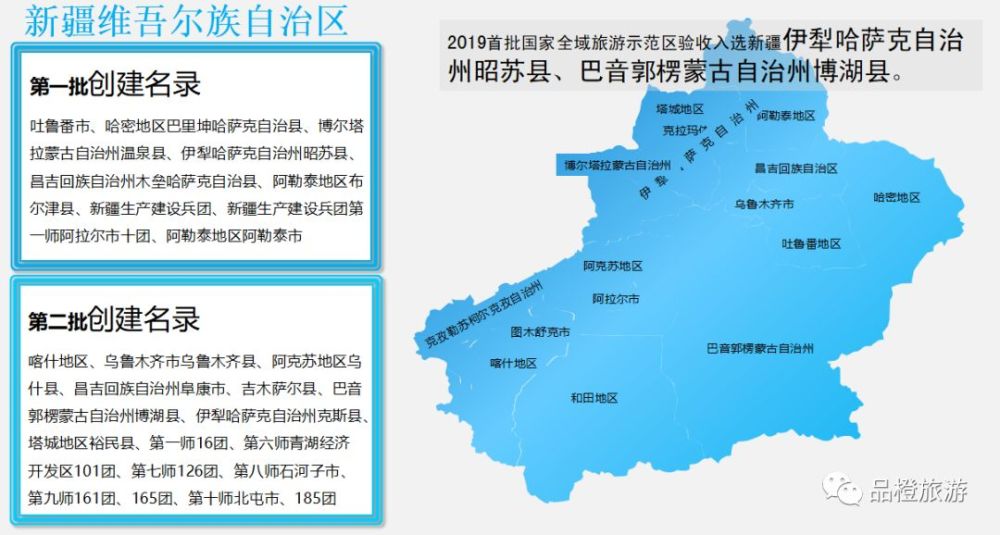 在2016国家全域旅游示范区创建名录中,新疆维吾尔自治区首批入选9个、第二批入选16家。本次有2个正式入选“首批国家全域旅游示范区”,分别是伊犁哈萨克自治州昭苏县和巴音郭楞蒙古自治州博湖县。