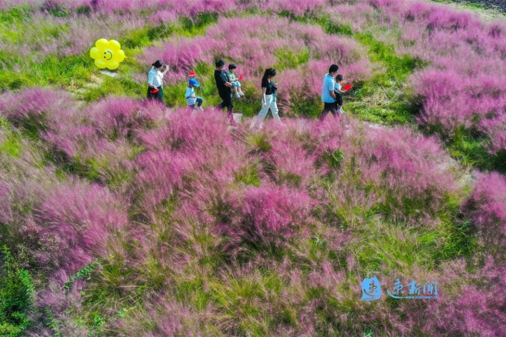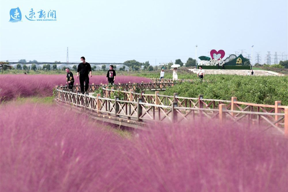 10月2日,泗阳成子湖旅游度假区内,游客在粉黛乱子草间打卡拍照。裴成(泗阳)