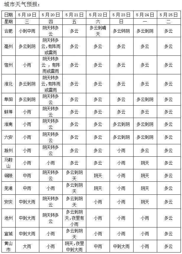 具体预报:今天全省阴天转多云,淮北北部有阵雨或雷雨,淮河以南东部部分地区有小雨并渐止。全省偏北风2~3级,雷雨时阵风7级。最低气温:淮北地区15~17℃,江淮之间16~18℃,江南17~19℃;最高气温:全省24~26℃。