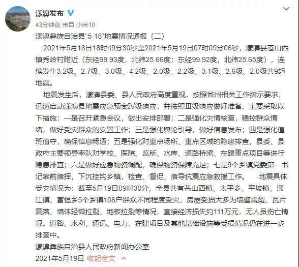 另据中国地震局消息,据中国地震台网测定,北京时间2021年5月19日20时5分在云南大理州漾濞县(北纬25.66度,东经99.92度)发生4.4级地震,震源深度8千米;北京时间2021年5月19日21时13分在云南大理州漾濞县(北纬25.68度,东经99.89度)发生3.2级地震,震源深度8千米。
