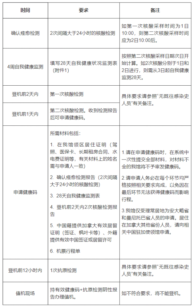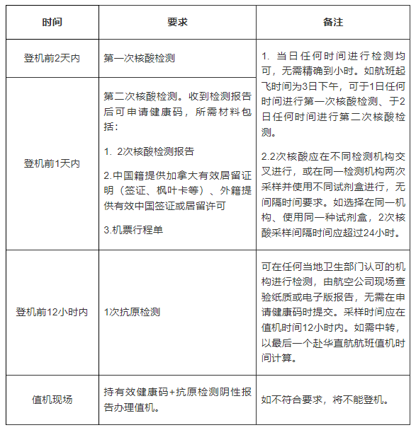 根据当前新冠肺炎疫情形势和国内最新要求及驻加拿大使馆统一安排,自2022年5月21日(含当日)起,对自我馆领区(安大略省、曼尼托巴省)乘坐赴华直飞航班人员行前检测要求进行调整,取消登机前7天核酸预检测、血清抗体检测、既往感染人员肺部CT或X光检测要求,所有人员统一在登机前进行两次核酸检测和一次抗原检测。