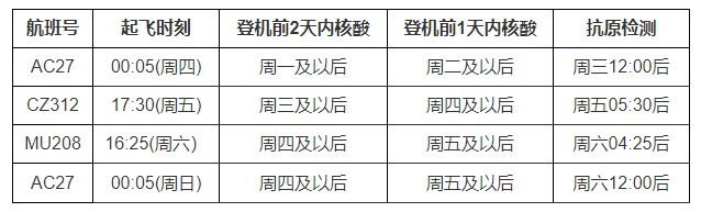 一、经商各航空公司,闭环管理时间由7天缩减为5天(例如,周三晚起飞的南航航班入住闭环宾馆时间为上周周六下午4点前,周一下午起飞的东航航班入住时间为上周周四4点前,周六晚起飞的US-BANGLA航班入住时间为当周周二下午4点前)。