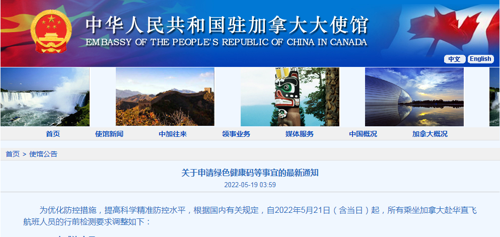 5月19日凌晨,中国驻加拿大大使馆发布《关于申请绿色健康码等事宜的最新通知》,通知显示,为优化防控措施,提高科学精准防控水平,根据国内有关规定,自2022年5月21日(含当日)起,所有乘坐加拿大赴华直飞航班人员的行前检测要求将有所调整。