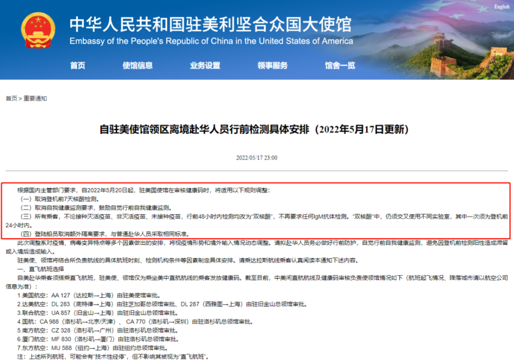 据中国驻美大使馆官网5月17日更新通知《自驻美使馆领区离境赴华人员行前检测具体安排》显示:根据国内主管部门要求,自2022年5月20日起,驻美国使馆在审核健康码时,将适用以下规则调整: