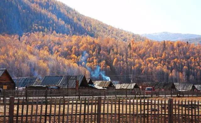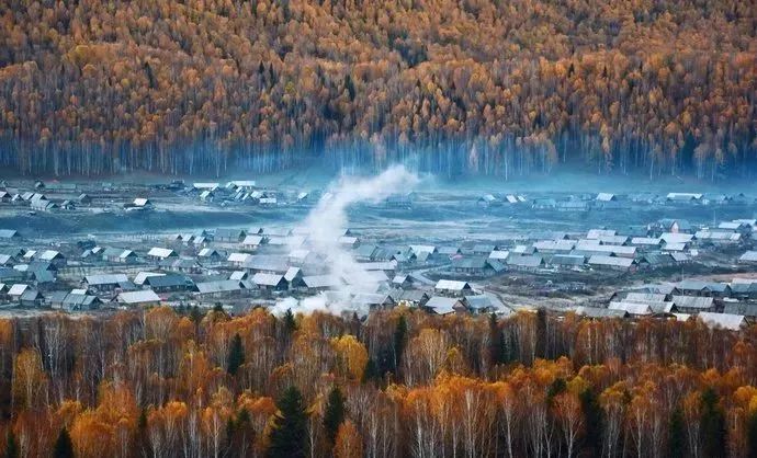 阳光照射在桦树林和山谷间的盆地,木楞房上炊烟升起,袅袅炊烟,仿佛不在人间。
