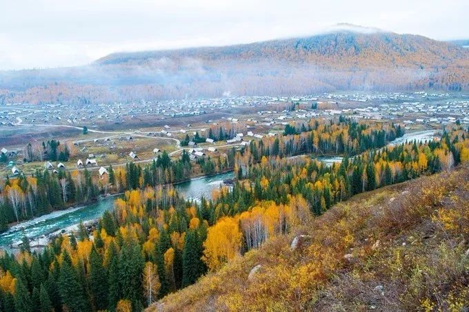 上到观景台,俯瞰禾木村全景,河流,村庄,森林,山峰,袅袅的炊烟,骑马的人影……