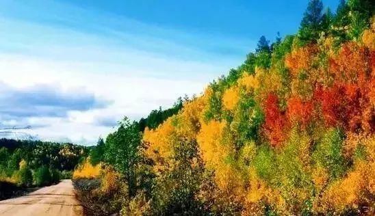 红叶漫山,层林叠翠,草甸边是漫坡金黄的白桦树。