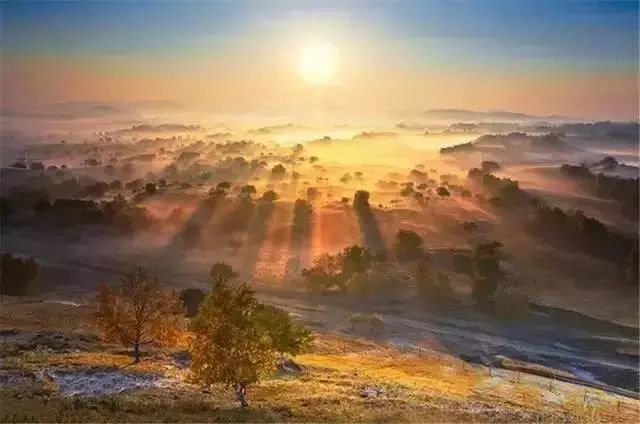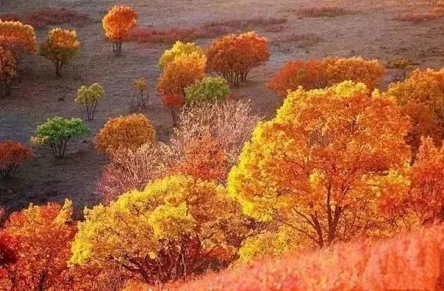 金黄的叶子,美轮美奂的日出,一望无际的天边草原,将坝上草原的秋色推向极致。