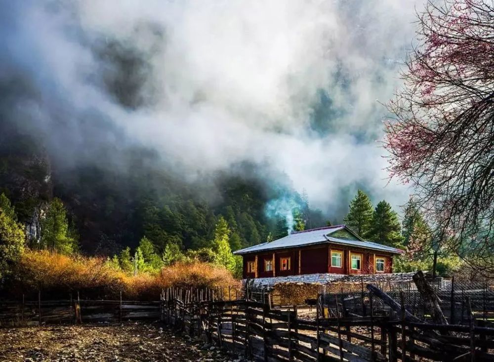 山间云雾时聚时散,雪山、林海、田园,与悠然自得的牛羊勾画出一幅恬静的高原田园风光图。