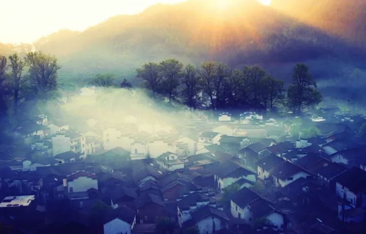 太阳从山那头跳出的一刹那,如瀑布般倾泻而下,照在粉墙黛瓦间,原本静美如水墨画的村庄立即变幻成了流光溢彩、灵气四溢的水粉画。