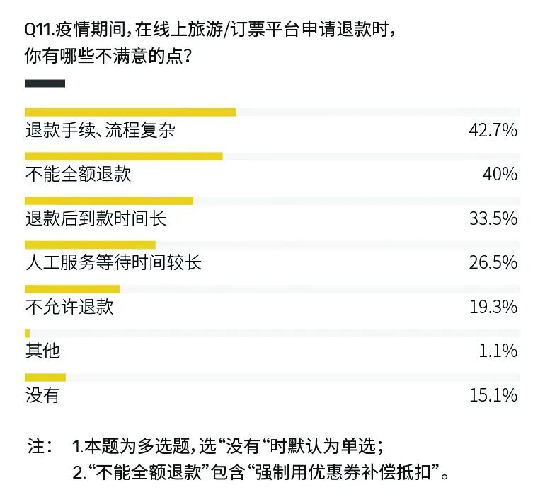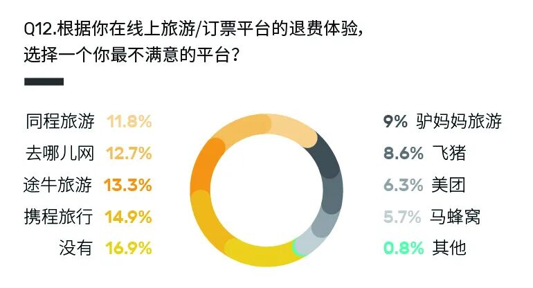 本刊通过交叉分析发现,勾选了“携程旅行”“去哪儿网”作为最不满意平台的受访者中,同时勾选“不能全额退款”要比勾选“退款手续、流程复杂”的百分比高,这与上图(Q11)中两项的大小比较存在出入。换句话说,在携程旅行和去哪儿网体验不佳的受访者更多是因为不能全额退款。