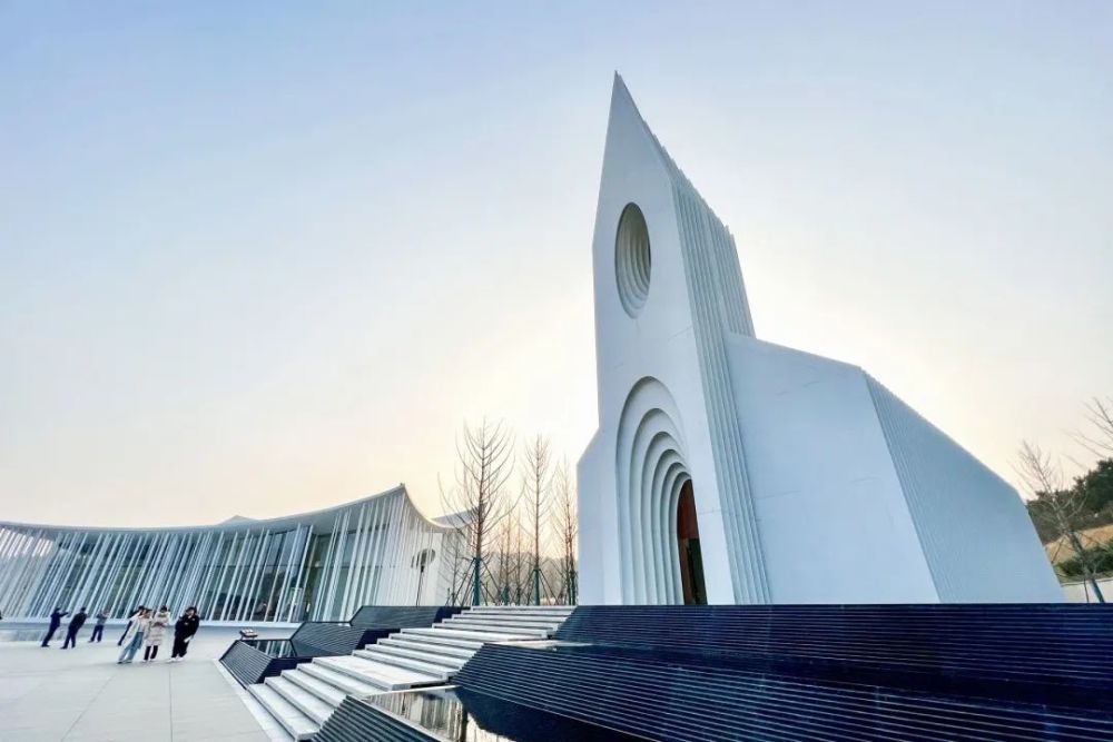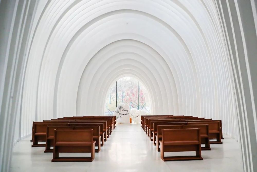 坐落在藏马山绿野阡陌间的月空婚礼堂,堪称“世界上最安静的婚礼堂”,是无数少女心目中的人间理想。当夜幕降临,暖黄色与纯白色的灯光亮起,外部切片所形成的内外轮廓的交叠,浪漫的氛围感瞬间拉满。