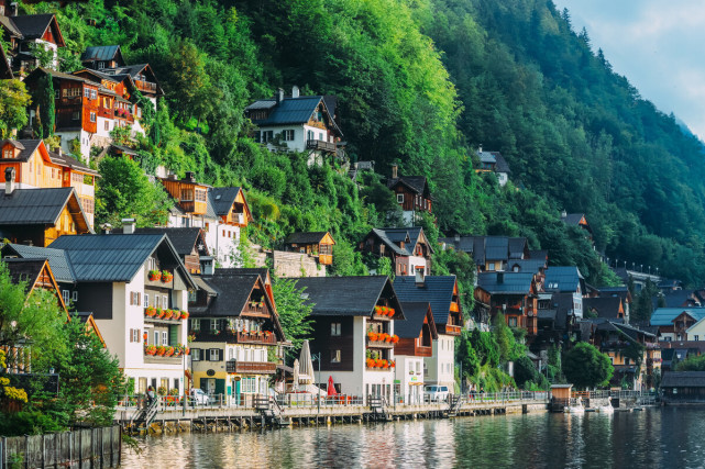 哈尔施塔特镇坐落在阿尔卑斯山脉之间,是奥地利最古老的小镇,这里四周雪山环绕,湖水清澈见底,湖岸边是鳞次栉比、如童话般清幽的住宅,让人流连忘返,被誉为欧洲最美小镇和著名爱情打卡地。