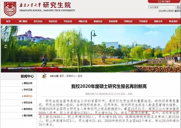 南京工业大学2020年报考人数9009人,同比增长24.7%。拟计划招收硕士研究生2300名左右,其中学术型硕士研究生880名左右,专业学位硕士研究生1400名左右(其中非全日制硕士研究生260名左右),整体报录比近4:1。