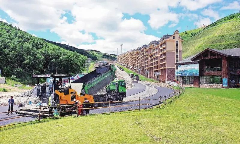 8月2日,施工人员在崇礼云顶滑雪公园新建奥运赛时由场馆驶出车辆通行道路——场馆内1号道路进行路面施工作业。