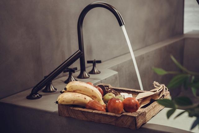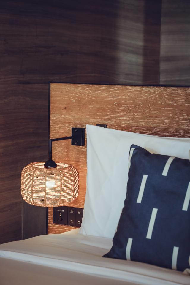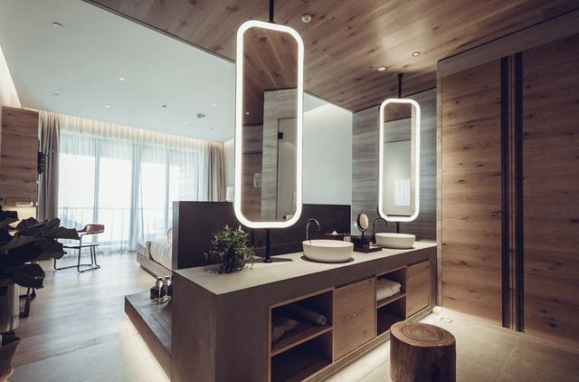 住在9层的海景大床房,原木的桌椅很有feel,粗犷简洁的布艺沙发,深色金属质感的水龙头,水泥和石质的浴缸和台面,舒服柔软的大床,极简却又充满设计感,有工业风的硬朗却又不失温暖温柔。