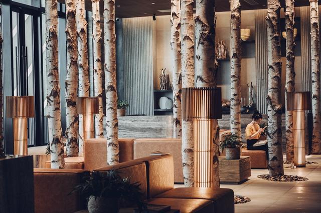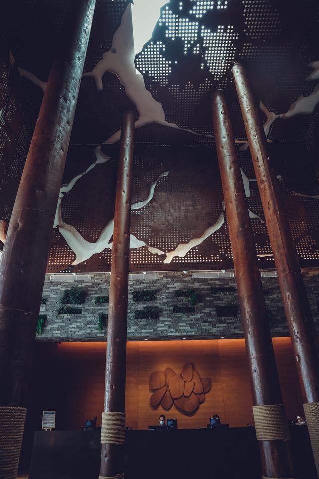 走入大堂,阳光从天窗透过几根不规则排列的高大圆柱洒向地面,像极了走进暗黑森林的感觉。公共区域的装饰大量使用了具有海南当地文化特色的船板、铁皮、藤条,还搜罗了大兴安岭的白桦树,湖北红安老区的青砖黑瓦,配合温暖的灯光,除了光影斑驳的自然氛围,也透出底蕴浑厚而高级的质感,许多角落拍照非常时尚ins风,一不小心就将环保做成了网红。