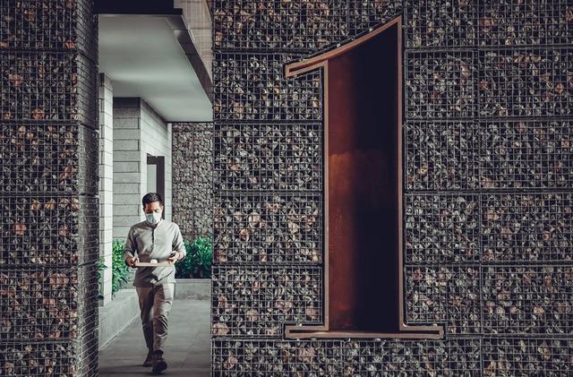 海南粗犷斑驳的火山石,被集合在铁丝笼中打造成沧桑原始的外墙,石头上自然形成的色彩从暗蓝到深褐变化多端,夹杂于墙体板块中由浅到深的绿色苔藓地衣和品种繁多的绿植,给后工业风的硬朗建筑披上了生机勃勃的外衣。