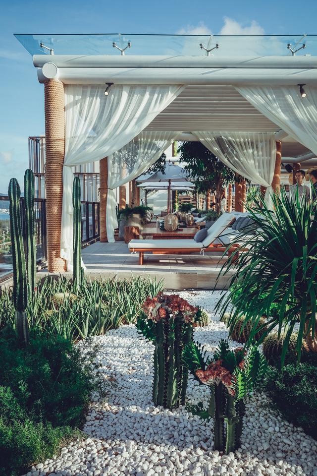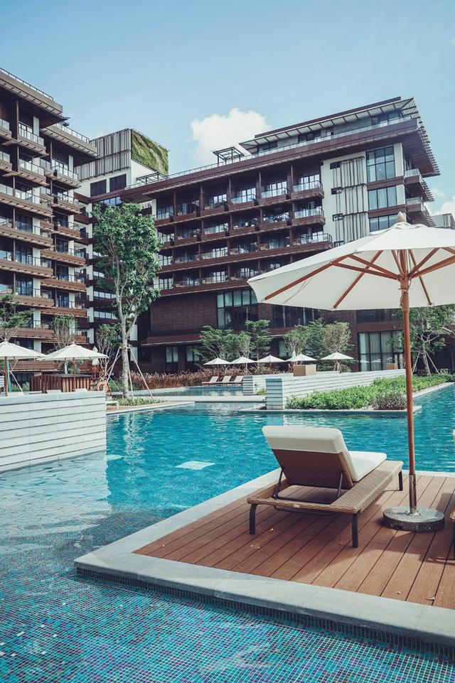 酒店内外大大小小的“1”字造型已经成为独特的标志,不同材质有着不同的风范。庭院中高大的榕树和凤凰树遍布,原木和砾石组成的现代雕塑散落其中,淡蓝色的泳池配上浅白的遮阳伞,没有大面积的鲜艳花朵,色调上却更加和谐,将环保理念与酒店设计完美融为一体,打造出奢华静修之所。