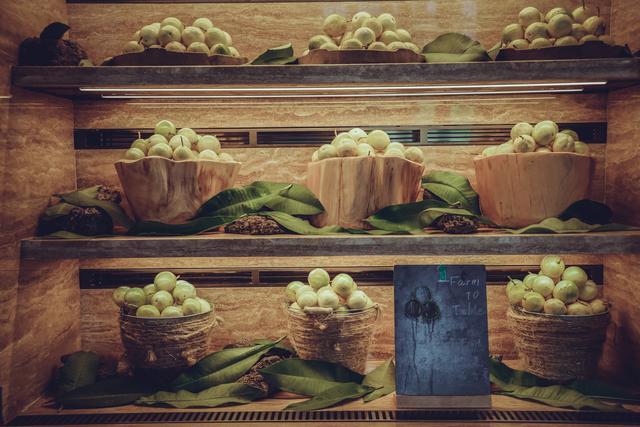 酒店对客人在吃上很是大方,房间内配了大量免费零食,mini bar畅饮。大堂的农果站摆满了新鲜莲雾、杨桃和百香果,任客人品尝,我对百香果的倒牙酸是有心理阴影的,没想到这种白色的百香果出乎意料的甜,所有小伙伴都被安利了。原来这些水果和餐厅里的蔬菜都来自酒店自己在附近的生态农场,真正实现了从农场到餐桌的绿色理念,自然熟的百香果和我们在超市买的当然味道也是不一样的。