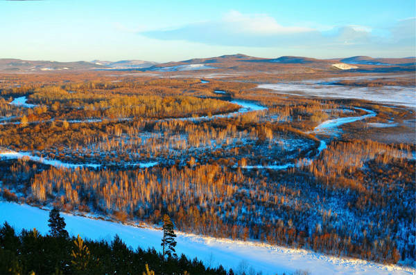 九曲十八弯,荡气回肠,这里是摄影与旅游爱好者必去之地,是天然形成的原生态湿地,站在观景台上举目远眺,山上的青松茂密,层层叠叠、四季的都有不同的色彩,冰冻的额木尔河水,如白龙盘卧在森林之间。