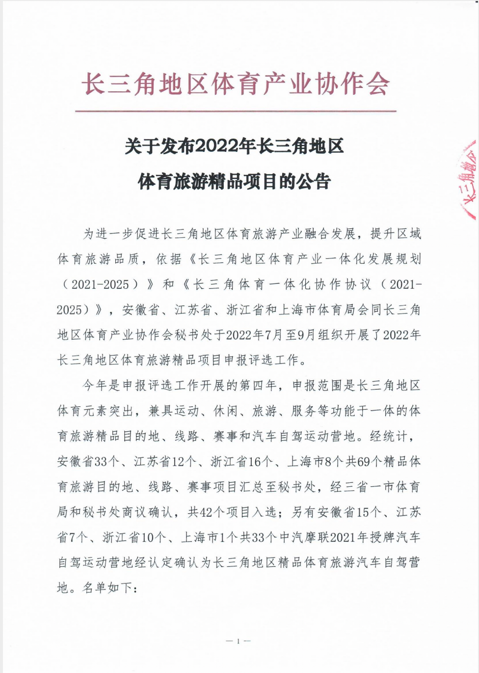 为深化长三角体旅融合、加强区域体育资源共享、推动长三角体育一体化更高质量发展。近日,“2022年长三角地区体育旅游精品项目”榜单揭晓,来自沪苏浙皖三省一市的17个体育旅游精品目的地、9个体育旅游精品线路、16项体育旅游精品赛事和33个汽车自驾运动营地上榜。