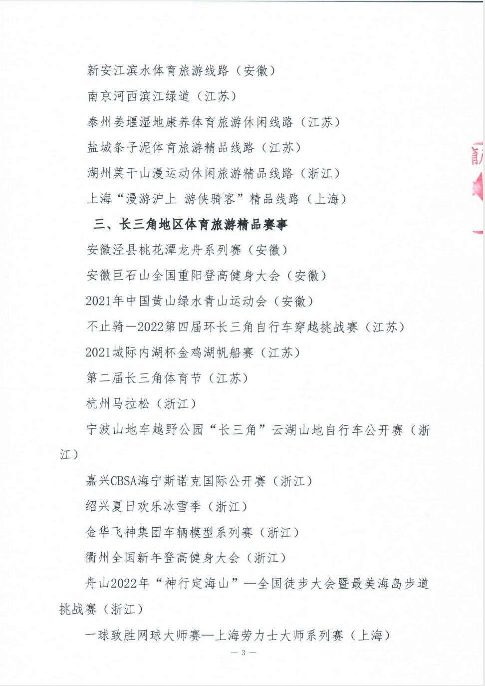 长三角地区体育旅游精品赛事分别为:安徽泾县桃花潭龙舟系列赛、安徽巨石山全国重阳登高健身大会、2021年中国黄山绿水青山运动会、不止骑·2022第四届环长三角自行车穿越挑战赛、2021城际内湖杯金鸡湖帆船赛、第二届长三角体育节、杭州马拉松、宁波山地车越野公园“长三角”云湖山地自行车公开赛、嘉兴CBSA海宁斯诺克国际公开赛、绍兴夏日欢乐冰雪季、金华飞神集团车辆模型系列赛、衢州全国新年登高健身大会、舟山2022年“神行定海山”—全国徒步大会暨最美海岛步道挑战赛、一球致胜网球大师赛—上海劳力士大师系列赛、环法中国系列赛全民绕圈赛·上海临港新片区站、2021凯迪拉克长三角马术青少年联赛-上海嘉定站。