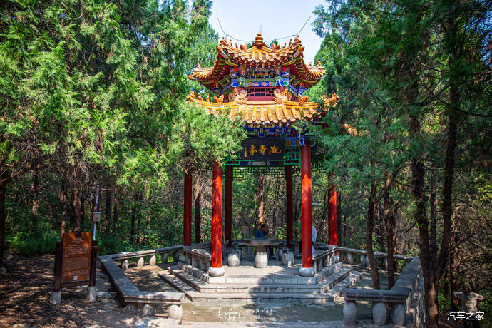 踩着台阶缓缓向上,第一个值得停留的地方便是:望寿阁。位于北极山腰,由正阁、东西厢房和垂花门组成。置身阁中,写着“寿比南山”字眼的石碑立于院中,与山顶的“寿”字遥相呼应。故名望寿阁。