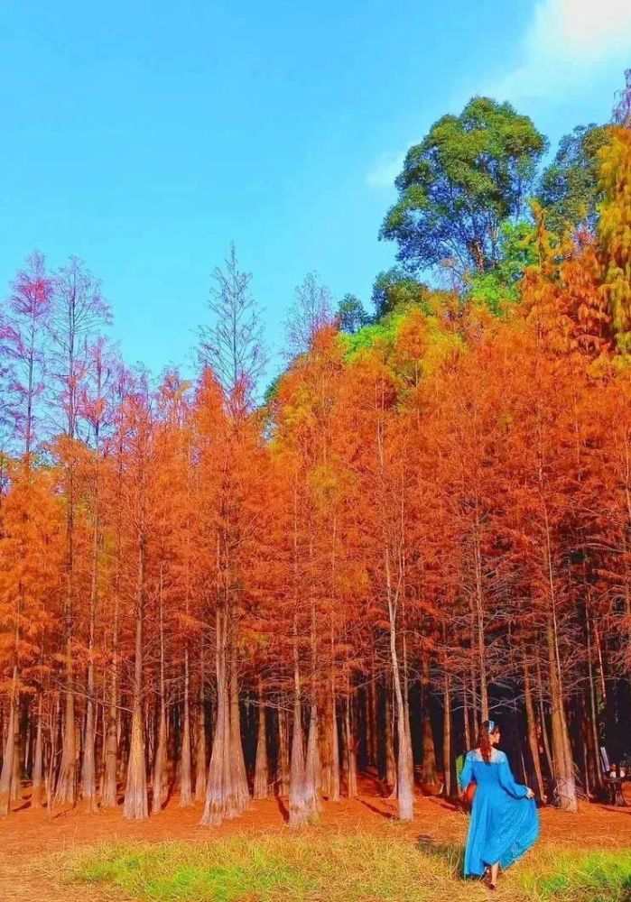 大夫山森林公园里的落羽杉随着气温逐渐变冷,颜色也逐渐变为金色或古铜色,与其他常绿叶树交相辉映,倒映于湖面上,形成独特的红叶风景线,看起来就好比一幅油画,非常悦目。园内还设有烧烤场、垂钓场、游艇码头、风筝场、儿童游乐场、成人游乐场、航模码头,还有茶室和多个服务部等。在这里徒步、骑单车、野餐,也是不错的选择。
