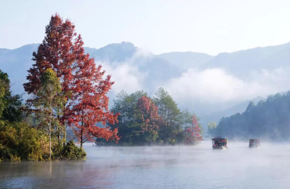 万绿湖山青水秀,进入秋冬,万绿湖中的龙凤岛就会渐渐出现特别的色彩,浅绿、金黄、橙红、红火,缤纷而富有层次感。湖边有一棵枫树和一棵樟树互相缠绕,绿中有红,红中藏绿,不分彼此,如恩爱夫妻。这里的红叶也是独特的,两片齐生,一左一右,如两颗相印的心,是情侣出游的“圣地”。