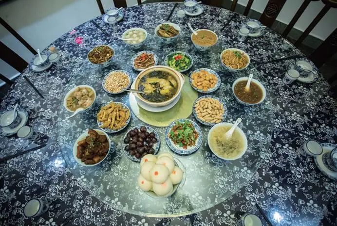 顾名思义,就是十碗八盘菜式,十碗依次为:红烧鸡、爆两冬、炖海参、红烧鱼翅、红烧块肉(外加发包)、虾米羹、焖粉、红烧鱼(或鱼圆汤)、走油蹄和炒黄鱼肚。八盘是:瓜子、花生、海蜇丝、米粉、炒排骨、猪肝(或猪耳朵)、皮蛋以及两盘水果。