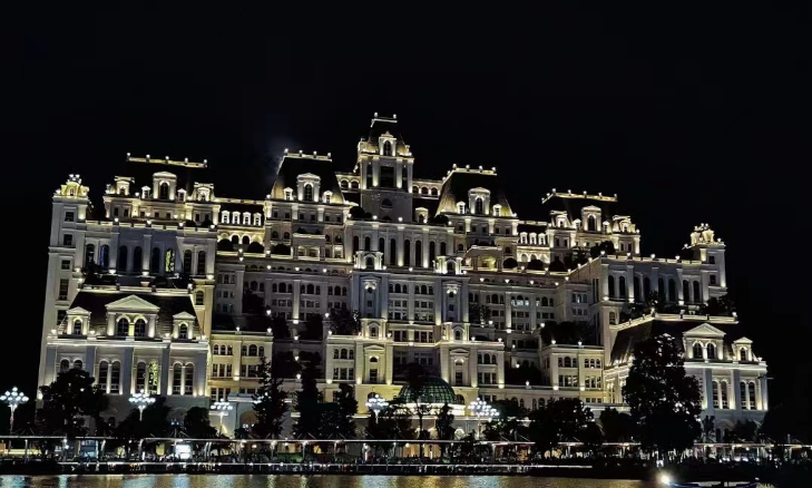 花果园白宫,既是贵阳城中的方向标,也是贵阳的网红地标建筑,通体以白色为主色调,华丽精致,犹如一座半山城堡矗立河畔,与花果园湿地公园人工湖、音乐喷泉、风车融为一体,独具一格。