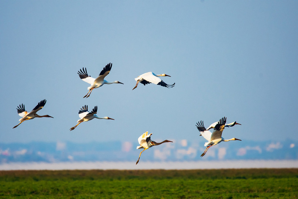 鄱阳湖上承赣、抚、信、饶、修五河之水,下接长江。丰水季节浪涌波腾,浩瀚万顷,水天相连;枯水季节水落滩出,野草丰茂,芦苇丛丛;湖畔峰岭绵延,沙山起伏,沃野千里,候鸟翩飞,牛羊倘佯。美丽富饶的鄱阳湖养育了世代生长居息湖畔的万物生灵。