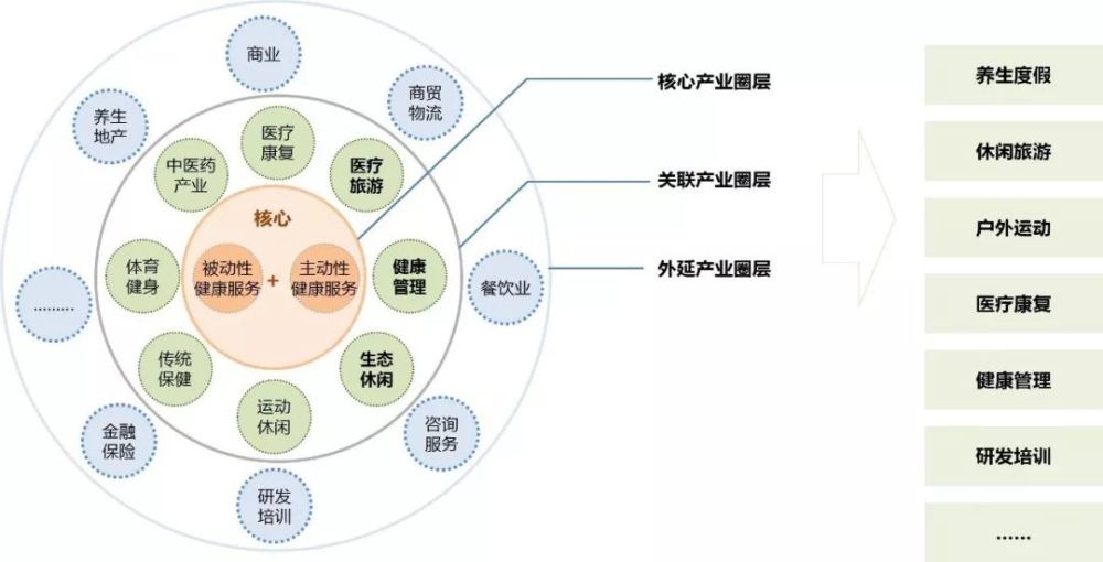 按照产业价值圈层来分,康养产业的核心圈层主要是提供主动和被动的健康服务的业态,关联圈层为提供与健康结合紧密的服务,如健康管理、运动健身、医疗康复等,外延圈层则是为康养产业提供全面支撑的业态,包括了研发、商业、培训、地产等,如下图所示。