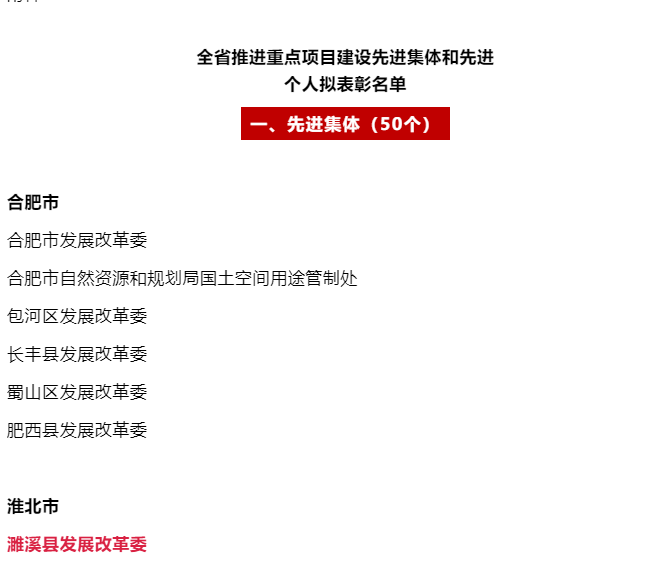 2022年11月28日,省政府网公示2019—2021年全省推进重点项目建设先进集体和先进个人拟表彰名单,濉溪县发展改革委入选。