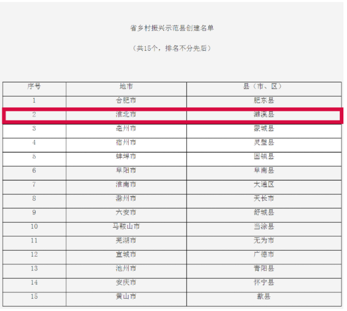 2022年12月26日,中共安徽省委农村工作领导小组办公室下发通知,公布“115“乡村振兴示范工程创建名单。其中,濉溪县进入省乡村振兴示范县创建名单。