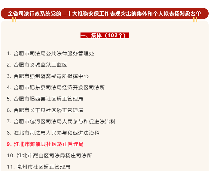 2022年12月30日,根据省司法厅《关于推荐全省司法行政系统党的二十大维稳安保工作表现突出的集体和个人的通知》(皖司明电〔2022〕72号)精神,在各推荐单位认真开展推荐评选的基础上,经省厅研究,拟确定102个集体、210人为全省司法行政系统党的二十大维稳安保工作表现突出的集体和个人,予以通报表扬。淮北市濉溪县社区矫正管理局榜上有名!
