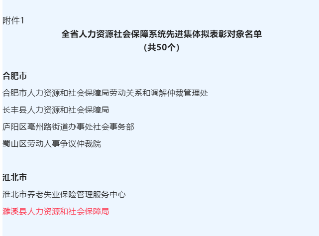 2023年1月4日,省人力资源和社会保障厅发布全省人力资源社会保障系统先进集体和先进工作者拟表彰对象公示,其中,濉溪县人力资源和社会保障局在列!
